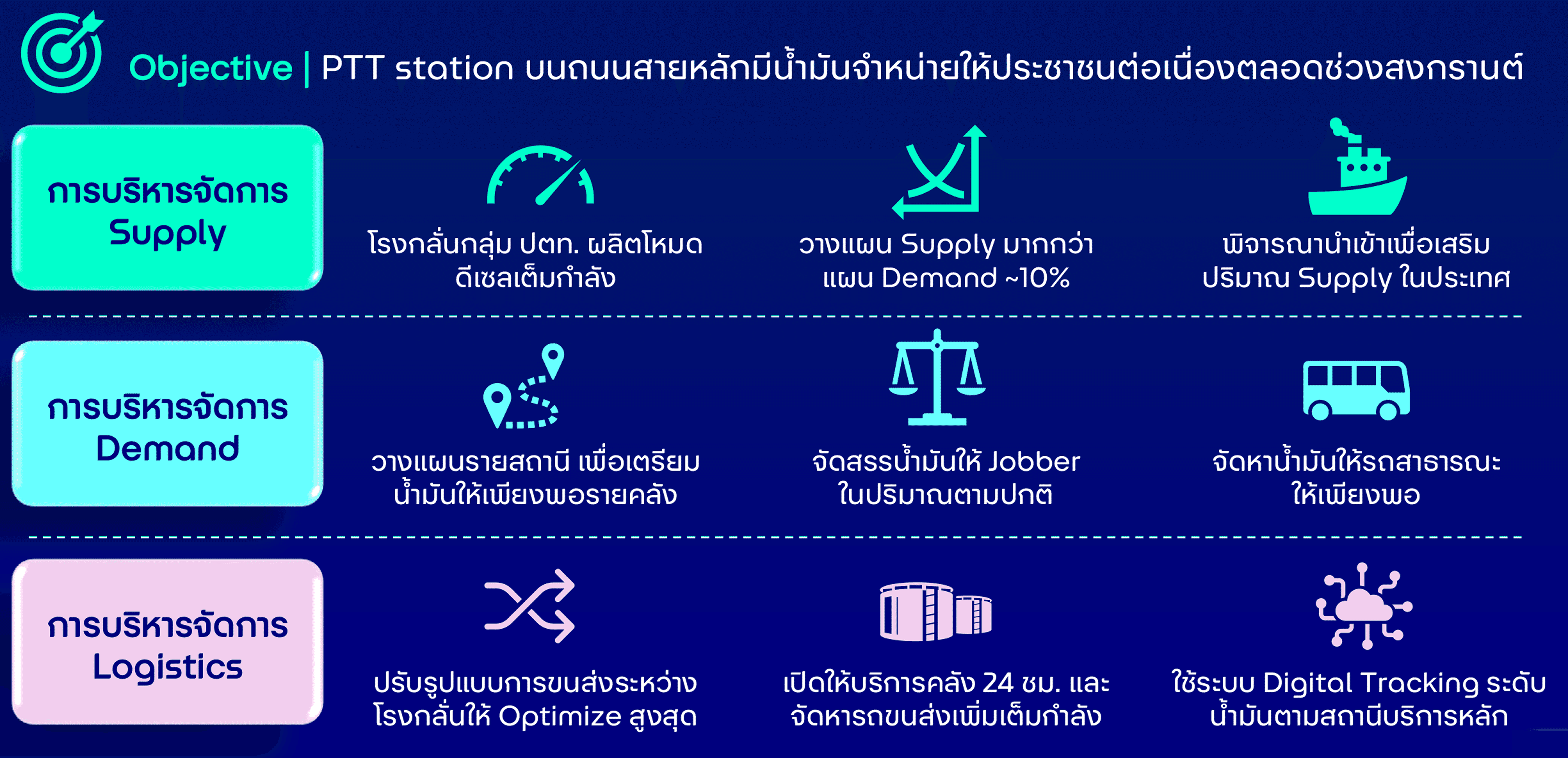 “โรงกลั่นและ OR จัดสรรและจำหน่ายน้ำมันสำเร็จรูปไปยังทุกภาคส่วน (ค้าส่ง ค้าปลีก อุตสาหกรรม) อย่างทั่วถึงและเพียงพอ เพื่อสนับสนุนการขับเคลื่อนเศรษฐกิจของประเทศ”